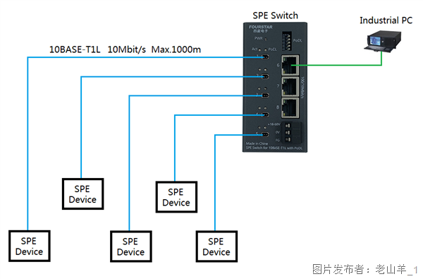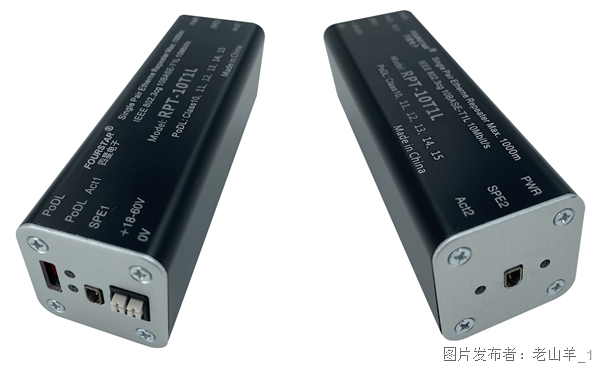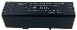 2、在现场终端受电设备前装置一个四星电子的SPE中继器RPT-10T1L,终端受电设备的电力由中继器的作业电源供应,这样就可悉数运用细缆节约费用,这时SPE交换机的PoDL供电能够封闭,不一样的功率等级下的最大电缆长度都可到达1000米,由于此刻SPE交换机到SPE中继器之间只传输数据。