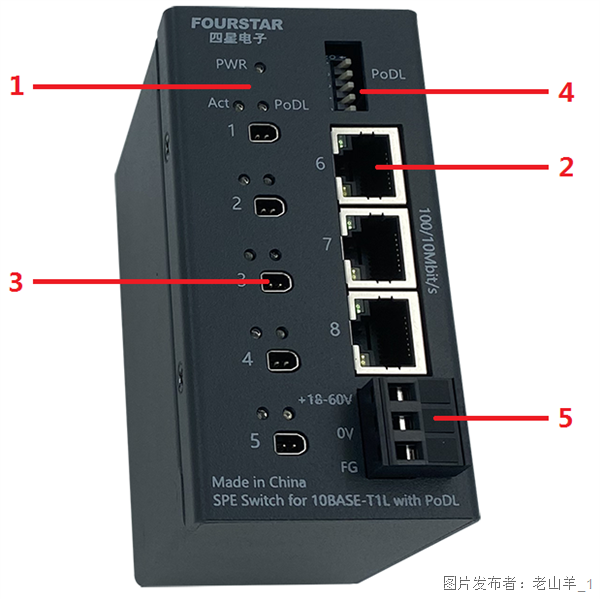 4、PoDL拨码开关:拨码开关设置PoDL供电的敞开与封闭。该5位拨码开关别离操控对应的5个SPE口的数据线供电的敞开与封闭,拨码开关按箭头方向往下拨为ON,对应的SPE口敞开PoDL供电,一起对应的PoDL指示灯点亮,此刻SPE电缆一起传输数据和电力,其输出的电压便是本产品输入的电源电压;向上拨为OFF,对应的SPE口封闭PoDL供电,一起对应的PoDL指示灯平息,此刻对应的SPE口只传输数据,没有电源供出。