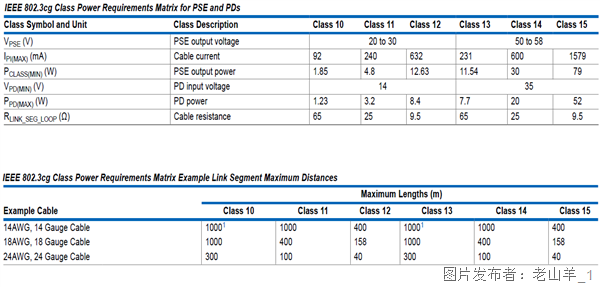 敞开PoDL供电时,由于SPE电缆中流过功率电流,会在电缆上发生必定的压降,功率越大压降越大,电缆电阻越大压降越大,所以在不同受电设备PD的功率等级下,电缆的截面积决议了最大传输间隔,参阅IEEE802.3cg规范。
